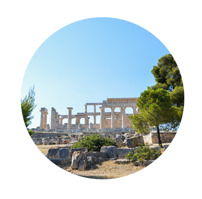The world famous temple of Aphaia (Athena) imposes at the top of a pine-covered hill in the northeastern part of Aegina. This temple constituted the epitome and prototype of the Parthenon, which was built by Ictinus and Callicrates. When the atmosphere is clear, one can see the Temple of Poseidon at Sounion and the Acropolis of Athens from the site of Aphaia. These three temples form an isosceles triangle (the holy triangle of the ancient times).